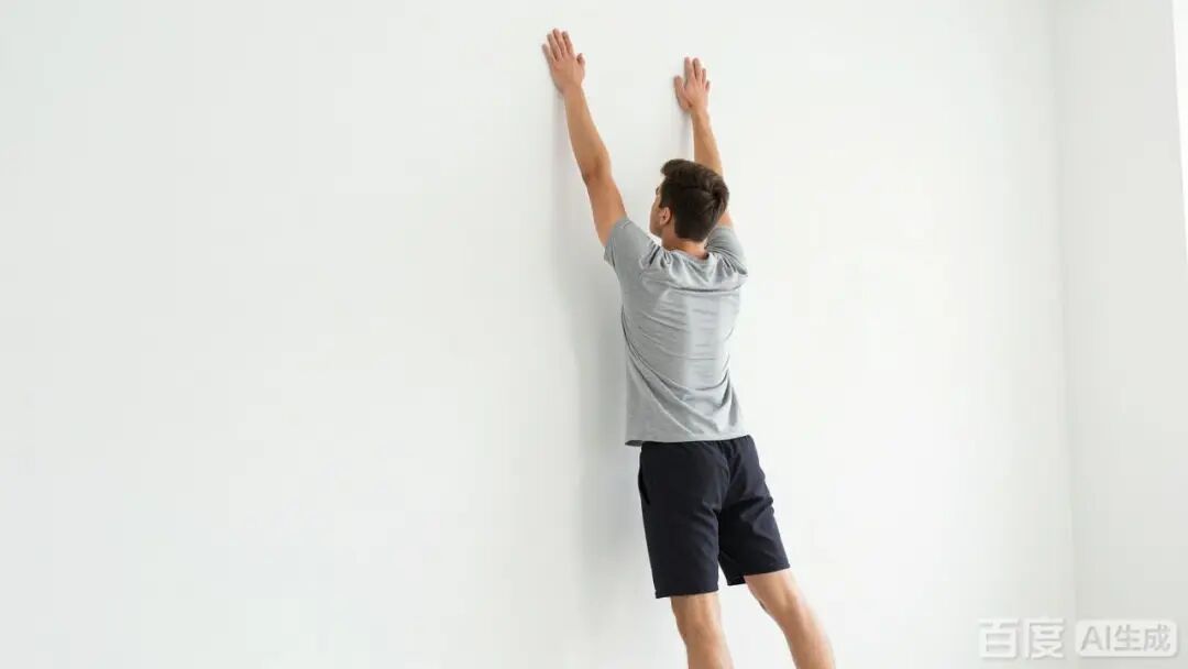 面对墙壁站立,用双手或单手沿墙壁缓缓向上爬摸,尽量拉伸整个身体后再缓缓退下,回到原处,反复进行。或者以一侧手指越过头顶摸对侧耳朵,两手交替进行,每天反复20次以上。