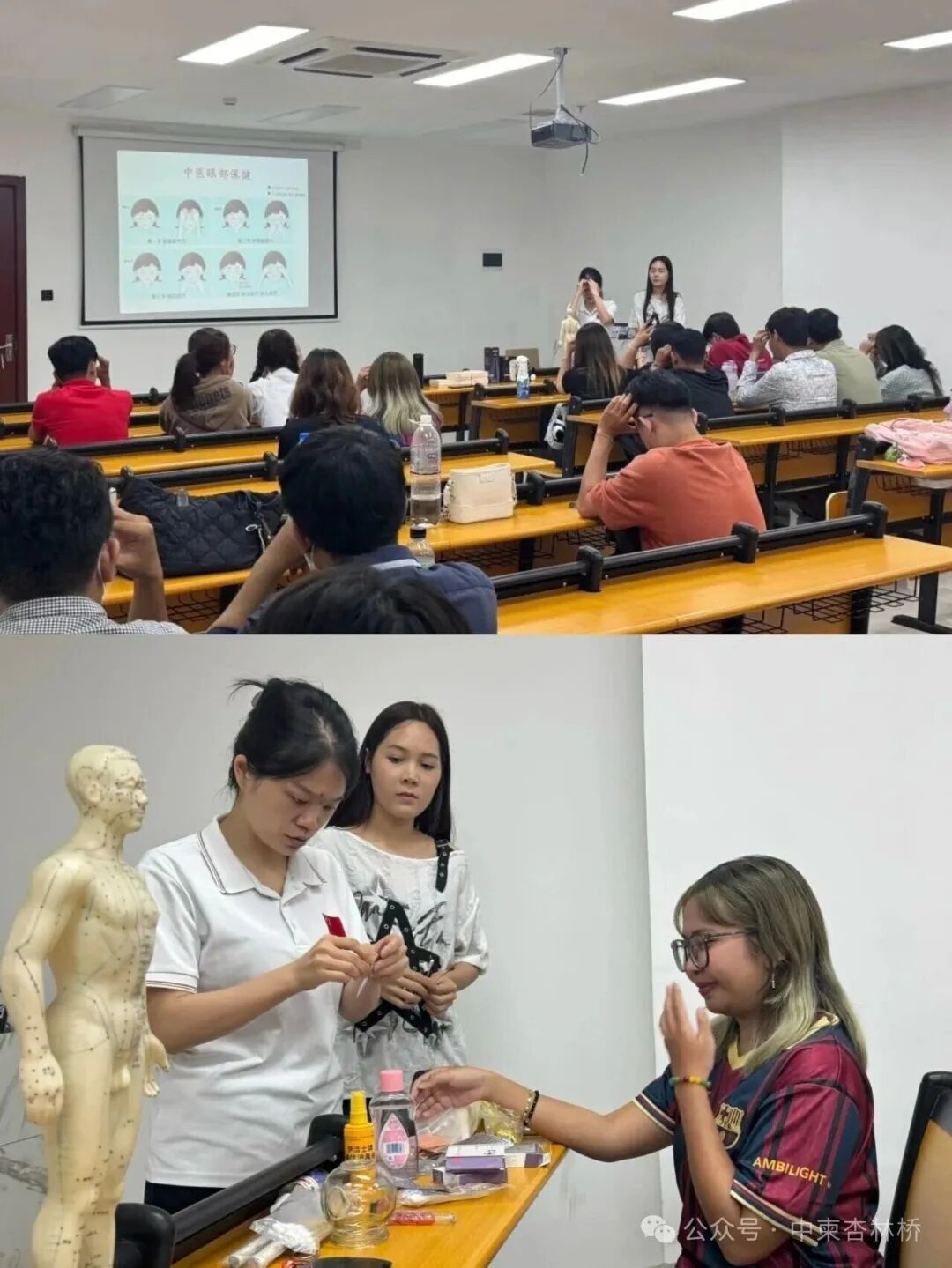 讲座中,医疗队队员用通俗易懂的语言、生动鲜活的案例,带领学生们走进中医药的世界。从中医药的起源与发展切入,深入浅出地阐释了“阴阳平衡”“辨证施治”的核心中医理念,解读了中医药与中国传统文化、哲学思想的深厚关联,让在场学生明白中医药不仅是治病救人的医术,更是承载着中华民族智慧的文化瑰宝。结合柬埔寨湿热气候特点,重点讲解了针灸、拔罐、刮痧和耳穴埋豆等中医适宜技术在当地常见病中的应用,让讲座内容更贴合当地学生的健康需求。