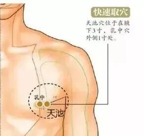 天池是心包经的第一个穴位,位于乳头外上方一寸,第4、5肋间。